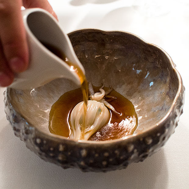 Cebola ou não? Eis a questão. É lula, camarão, amendoim e dashi. É o bilhete de ida ao oriente – ou o resultado de uma viagem de João Rodrigues na Tailândia – num prato que prima pela originalidade e comprova a criatividade e o trabalho constante na cozinha do Feitoria. Com o caldo, muito utilizado na cozinha nipónica, ainda quente, o chef rega a lula cortada em tiras muito finas – por baixo das quais estão os amendoins tostados e o camarão —, com o intuito de a cozinhar e, deste modo, a deixar com a textura de um noodle.