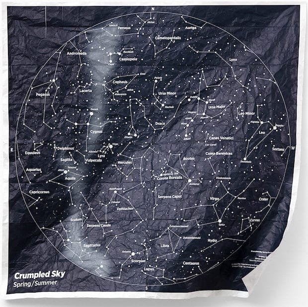 “Crumpled Sky” é uma pequena coleção de mapas contemporâneos dedicados aos céus estrelados que podemos ver a olho nu e é, mais que tudo, uma fonte inesgotável de sonhos. Dependendo de onde nos encontramos, o céu estrelado é diferente, mudando a cada estação. Assim, a coleção é composta por uma série de mapas que permitem que todos, em toda parte, possam viver a emoção de desvendar o céu em cada estação. Os mapas são macios, muito leves e extremamente resistentes, impermeáveis, projetados para serem rapidamente guardado na bolsa sem complicações geométricas de dobras e contra-dobras. São perfeitos para levar para todo lado nas noites estreladas, mas também são igualmente perfeitos para serem pendurado na parede. Conhecimento ou instrumentos científicos são totalmente desnecessários para ler este maps. Apenas precisa dos seus olhos e uma bela noite estrelada. Ah! E os donos destes mapas têm de ser, obrigatoriamente, sonhadores! Desenhado por Pizzolorusso, Crumpled Sky tem 87×87 cm e tem está disponível em Spring/Summer e Autumn/Winter, claro.
