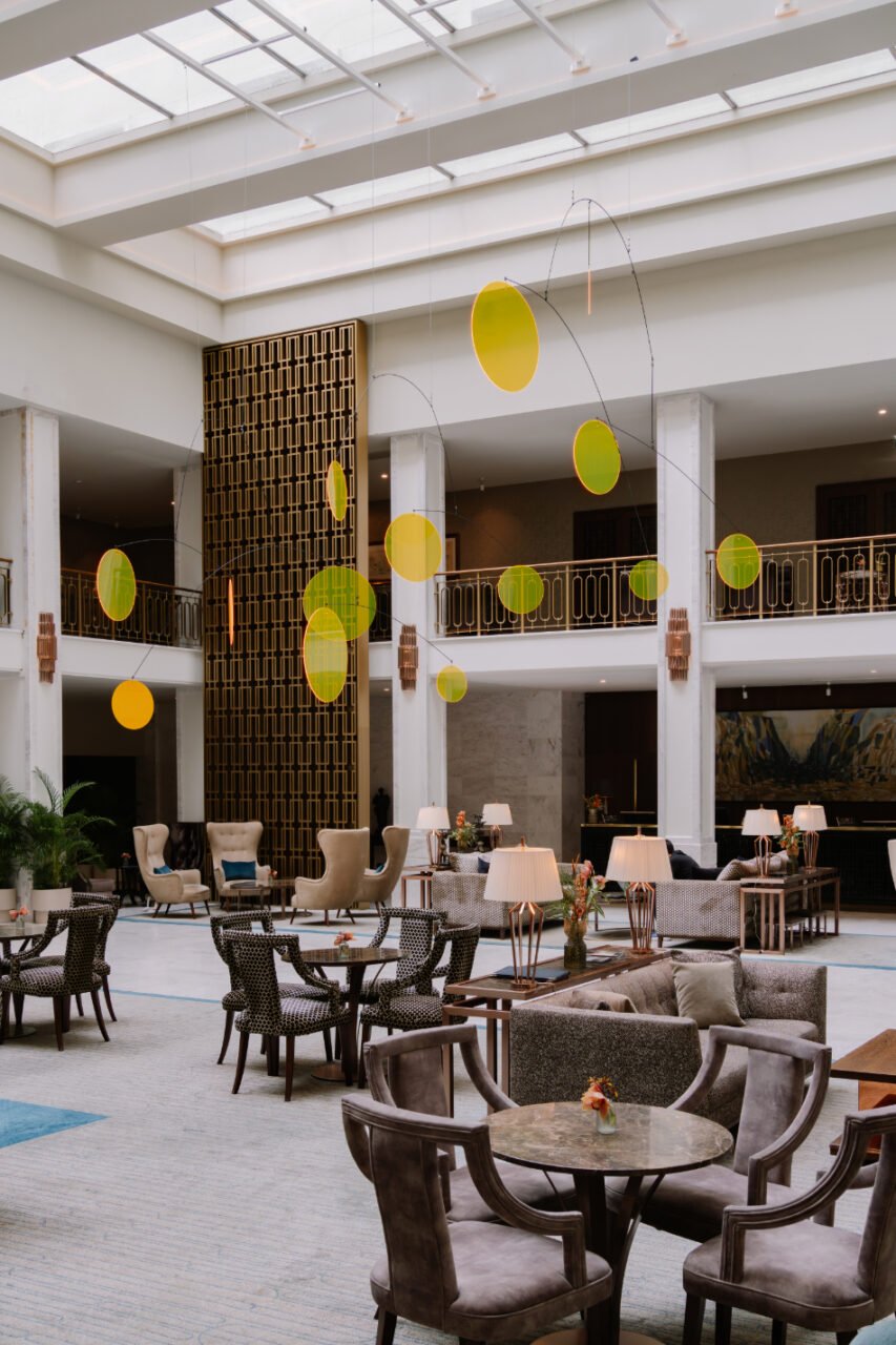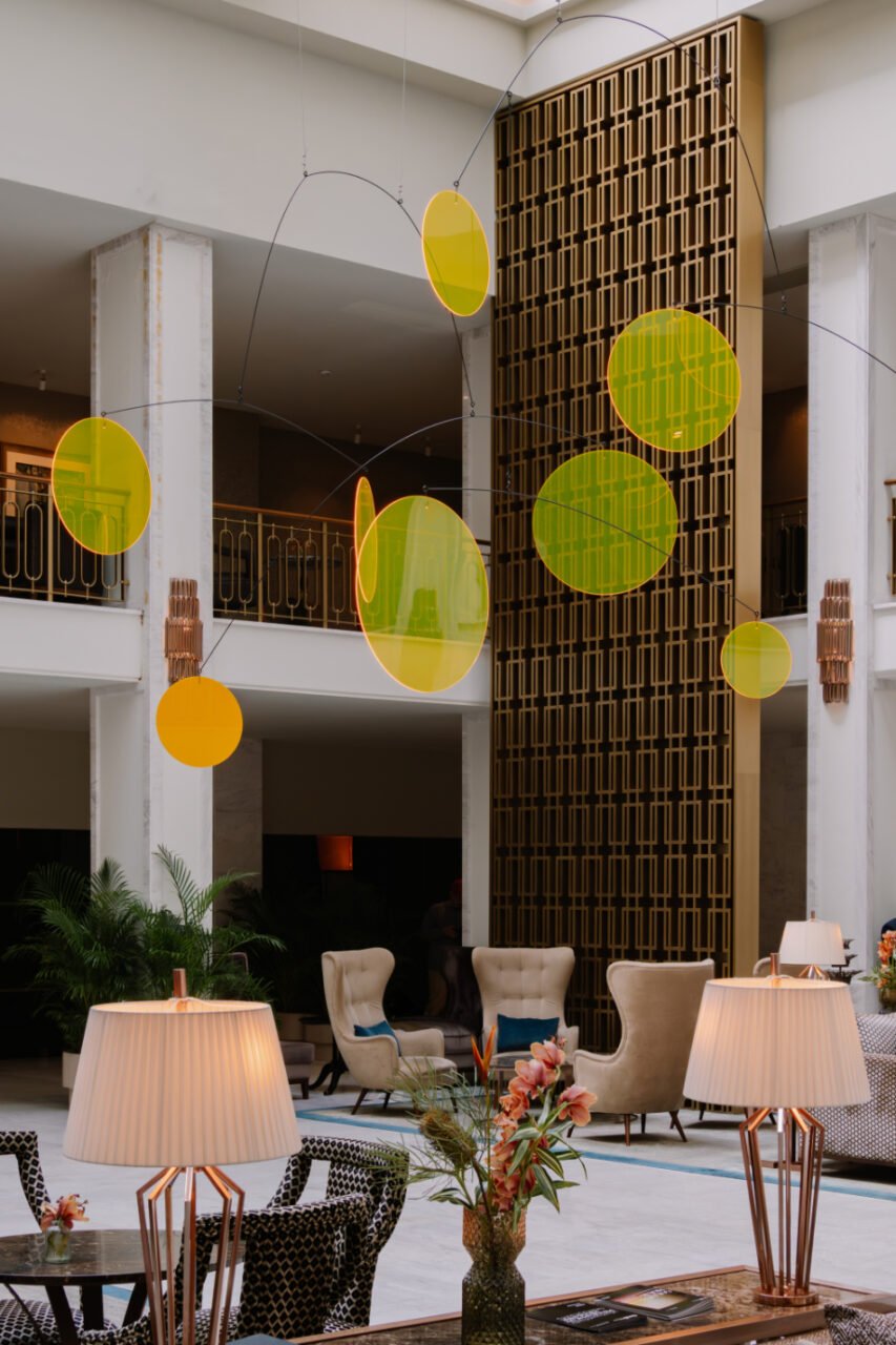 O enorme círculo em acrílico amarelo fluorescente disposto no lobby do hotel Tivoli Avenida Liberdade deixa antever a essência de Golden Hour: “Pode traduzir-se numa ode ao sol”, à luz dourada da época de estio, que aqui se apresenta numa pose estática. A declaração é de Ana Trancoso, a designer portuguesa criadora desta enorme peça, a quem foi dado o obséquio de dar as boas-vindas a quem chega a este nonagenário cinco estrelas da cidade de Lisboa.