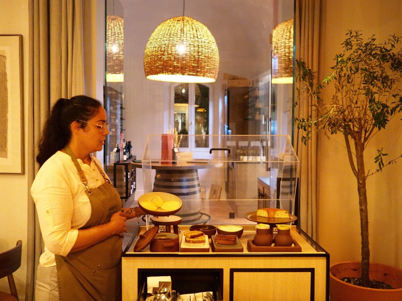 As sobremesas vão à mesa num carrinho de serviço, para serem apresentadas uma a uma – há farófias cozidas no forno, mousse de chocolate com um fio de azeite, marmelos bêbedos com pó de cogumelos, em época devida, e pudim de coentros