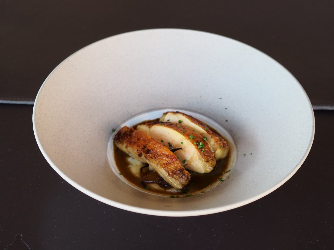 Coxa de frango, puré de batata, cogumelos e molho ponzu