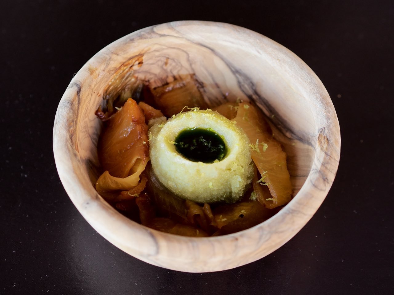 O cozido à portuguesa. No verão, tenho uma caldeirada um pouco mais algarvia, com tomate e pimentos; no inverno, vamos passar para uma caldeirada de enguias, um produto especial dos irmãos Norinho, da Figueira da Foz. A nossa melhor entrada é uma bifana e, agora, para o menu de inverno, devido a uma colaboração com uma padaria daqui, do Porto, que é a Brites, decidimos fazer um croissant com batata. Não gostava muito de utilizar bacalhau nos menus, porque quando temos um prato de bacalhau, os estrangeiros só pedem o bacalhau e não vendemos os outros. Uma vez que há mais de 3.000 maneiras de fazer bacalhau, vamos ter um prato de bacalhau. No verão, temos uma tarte de bacalhau, com tapenade e espuma do próprio bacalhau – a base da tarte é tipo uma massa folhada; o bacalhau é estufado, com cebolada e paprica; as aparas são estufadas com batata e cebola, trituramos e fazemos uma espuma; e fazemos a tapenade. Na próxima carta, temos um bacalhau cozido com todos, ou seja, como estamos a chegar à época natalícia, aproveitamos para desenvolver e tirar o proveito deste prato – servimos o lombo de bacalhau grelhado, com um creme feito à base de grelos e espinhas do bacalhau; os grelos são servidos cozidos, com pickles de nabo, grão-de-bico frito. Como cozinheiro, sempre me marcou chegar ao Natal e comer bacalhau cozido com todos. Quando estive em Londres, fiz uma panela de bacalhau cozido com todos e todos ficaram admirados, ao que eu expliquei que é uma tradição. No dia seguinte, servi o farrapo e todos disseram ‘devias ter servido isto ontem!’ Lembro-me de ver a minha, a minha avó e a minha tia na cozinha, a fazer o farrapo. A minha avó levava o mesmo tacho e a mesma colher de pau, onde era feita esta comida. É um momento em relação ao qual me lembro sempre.