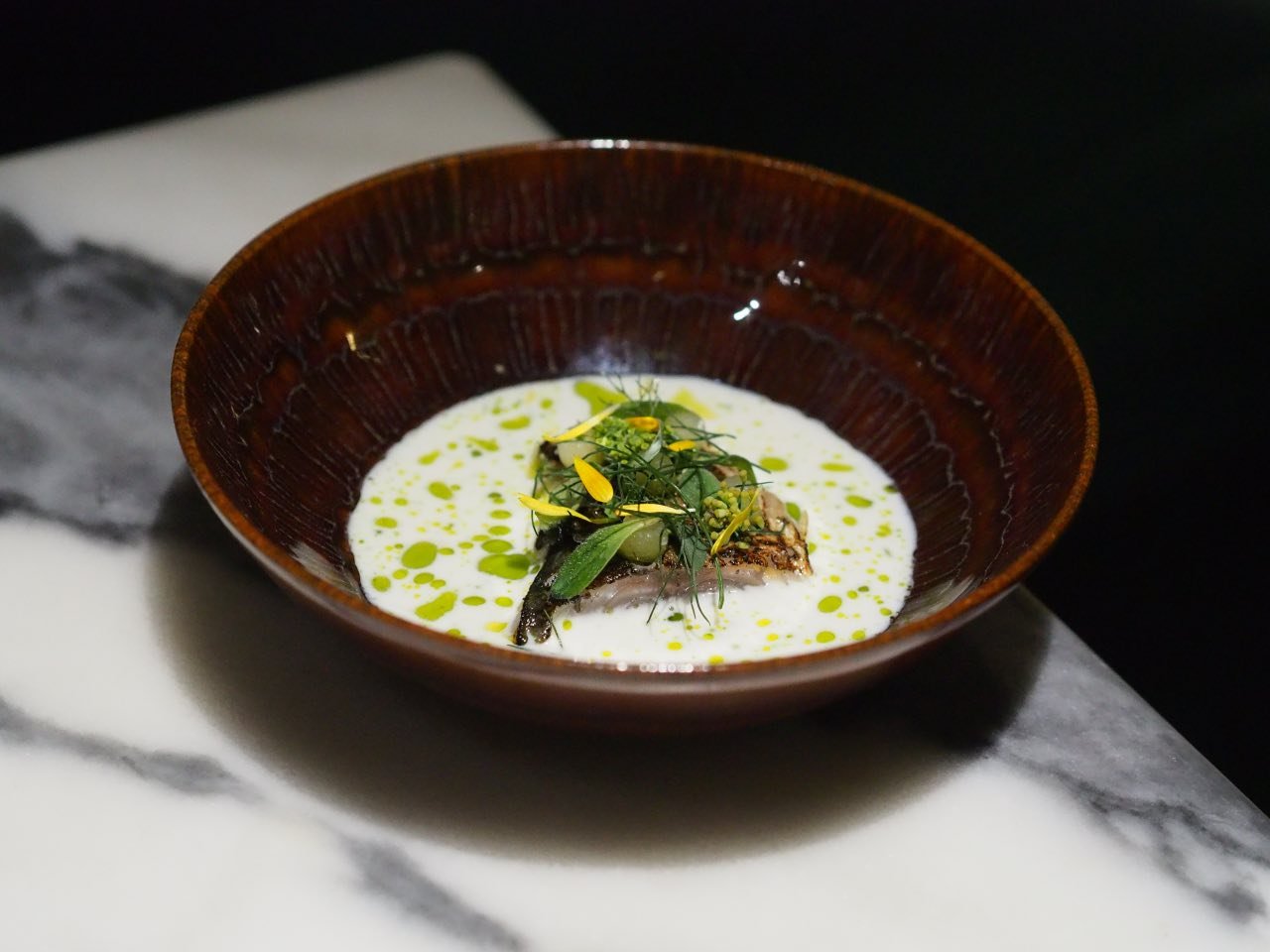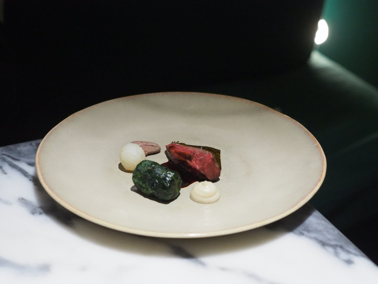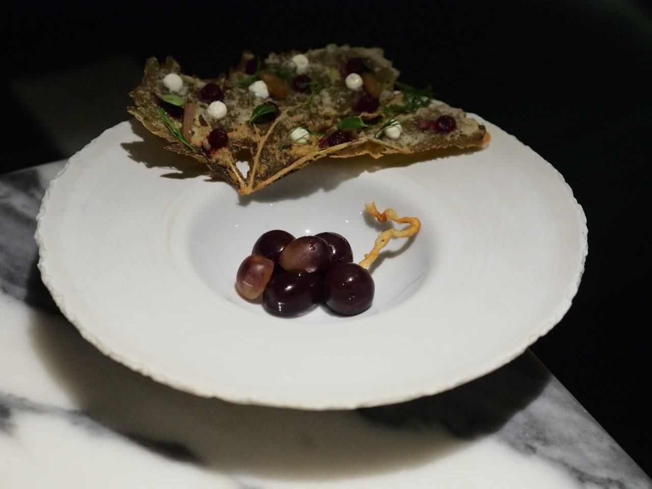 A rota gastronómica inicia-se com o lingueirão, arroz de coentros e azedinhas, trio concentrado numa espécie de cracker longitudinal, em alusão ao formato do molusco. O sabor de cada um dos elementos está bem presente, comprovando a genialidade de Louise Bourrat, que, num snack tão simples, à primeira vista, concentra a virtude criativa expectável de uma chef com experiência. A mesma consistência se coaduna com a tartelete de alcachofra, com secretos de atum e wasabi de capuchinha, acima de tudo a respeito da envolvência dos dois últimos ingredientes. O pão de milho, de textura suave, com caviar e trufa, ligeiramente picante e com a sensação gustativa a identificar a presença da manteiga, que o torna ainda mais guloso.