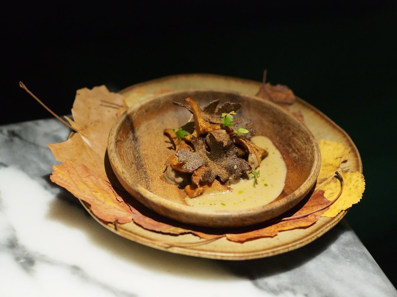 A inspiração no outono estende-se ao prato seguinte protagonizado por cogumelos selvagens, vinho Jerez e levístico. Aqui, os chanterelles conferem a textura carnuda e são acompanhados por folhas feitas a partir de trigo serraceno. A confeção do molho de cogumelos, ingrediente igualmente utilizado na feitura dos gnocchis, inclui a mesma referência vínica que harmoniza com este prato, o vinho de Jerez Barrialto Azacanes, um branco macerado, feito a partir da casta Palomino Fino, de Rafael Rodríguez Jiménez. Já o momento da carne é reservado ao pombo selvagem. Este produto também é apresentado desfiado e anizado, e envolvido em folhas de espinafres. Uma vez mais, a chef Louise Bourrat eleva o molho, com uma seleção de vinhos, desta feita feito a partir de vinhos Madeira e do Porto, e sakura, conferindo riqueza a este preparado sem exagerar na intensificação do sabor do mesmo.