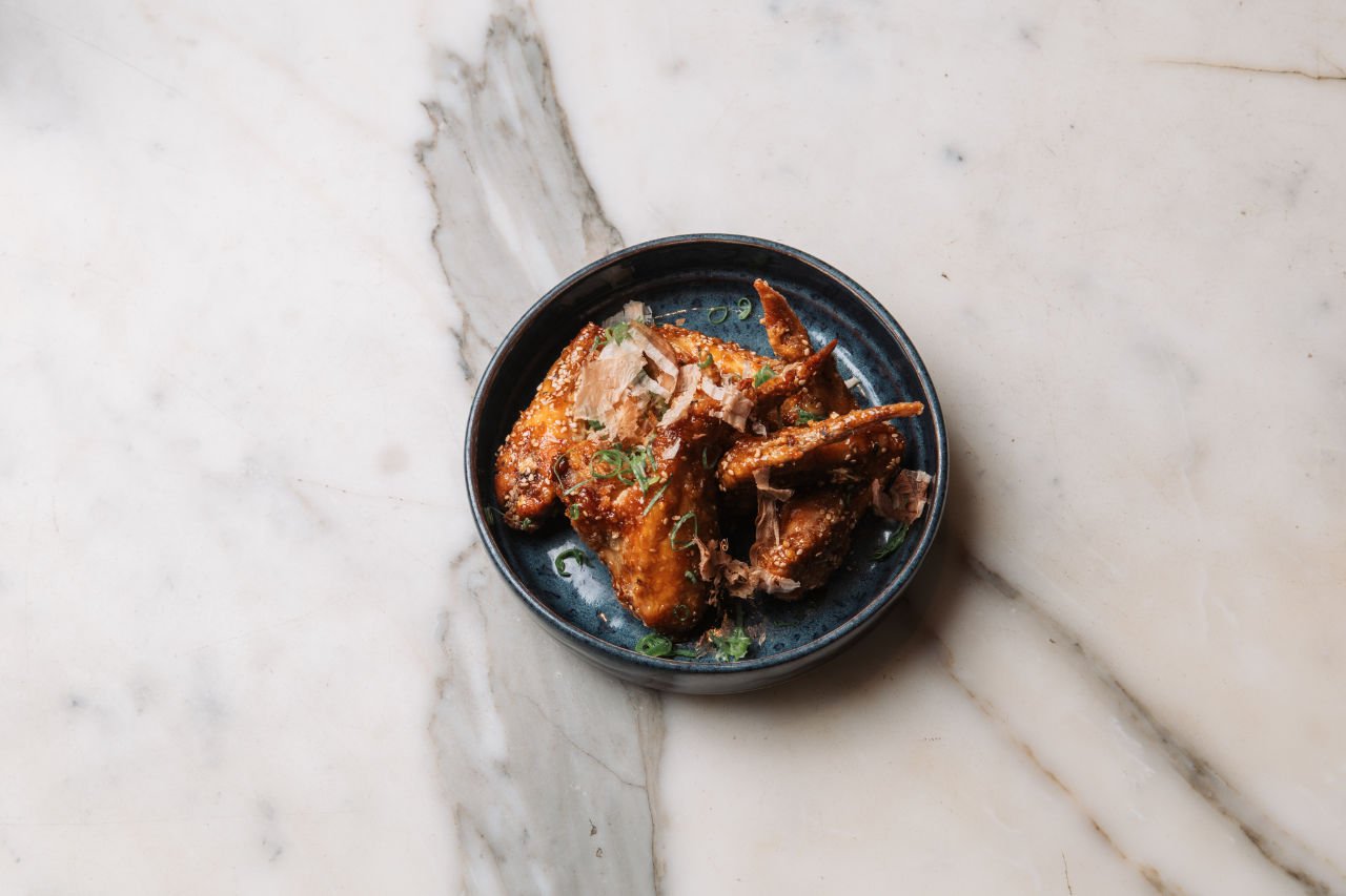 Mas a verdadeira criação-estrela do chef Nuno Gonçalves e, atrevo-me a dizer, do almoço, foram as asas de frango deep fried, cebolo, molho de soja, mirij, gengibre, e sementes de sésamo. Chama-se nagoya tebasaki e é para comer com as mãos sem vergonha de se lambuzar.